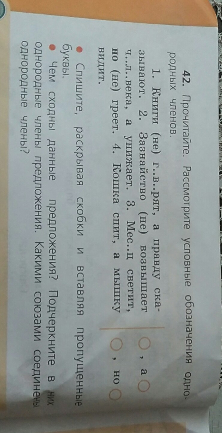Книги не говорят, а правду сказывают. Зазнайство не возвышает человека, а унижает. Месяц светит, но не греет. Кошка спит, а мышку видит.