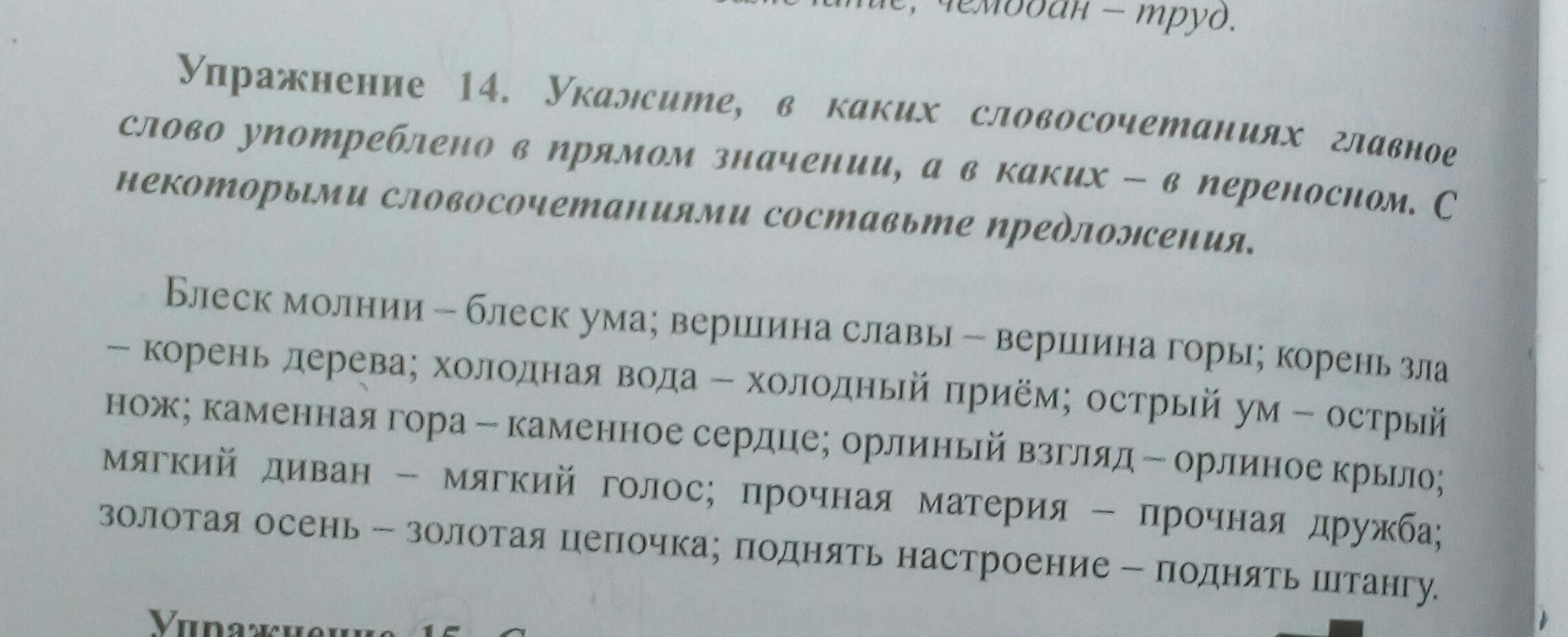 Блеск молнии (прямое значение) - Блеск ума (переносное); вершина славы (переносное) - вершина горы (прямое); корень зла (переносное) - корень дерева (прямое); холодная вода (прямое) - холодный прием (переносное); острый ум (переносное) - острый нож (прямое); каменная гора (прямое) - каменное сердце (переносное); орлиный взгляд (переносное) - орлиное крыло (прямое); мягкий диван (прямое) - мягкий голос (переносное); прочная материя (прямое) - прочная дружба (переносное); золотая осень (переносное) - золотая цепочка (прямое); поднять настроение (переносное) - поднять штангу (прямое).