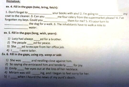 3 bring 4 fetch 5 take 6 fetch
