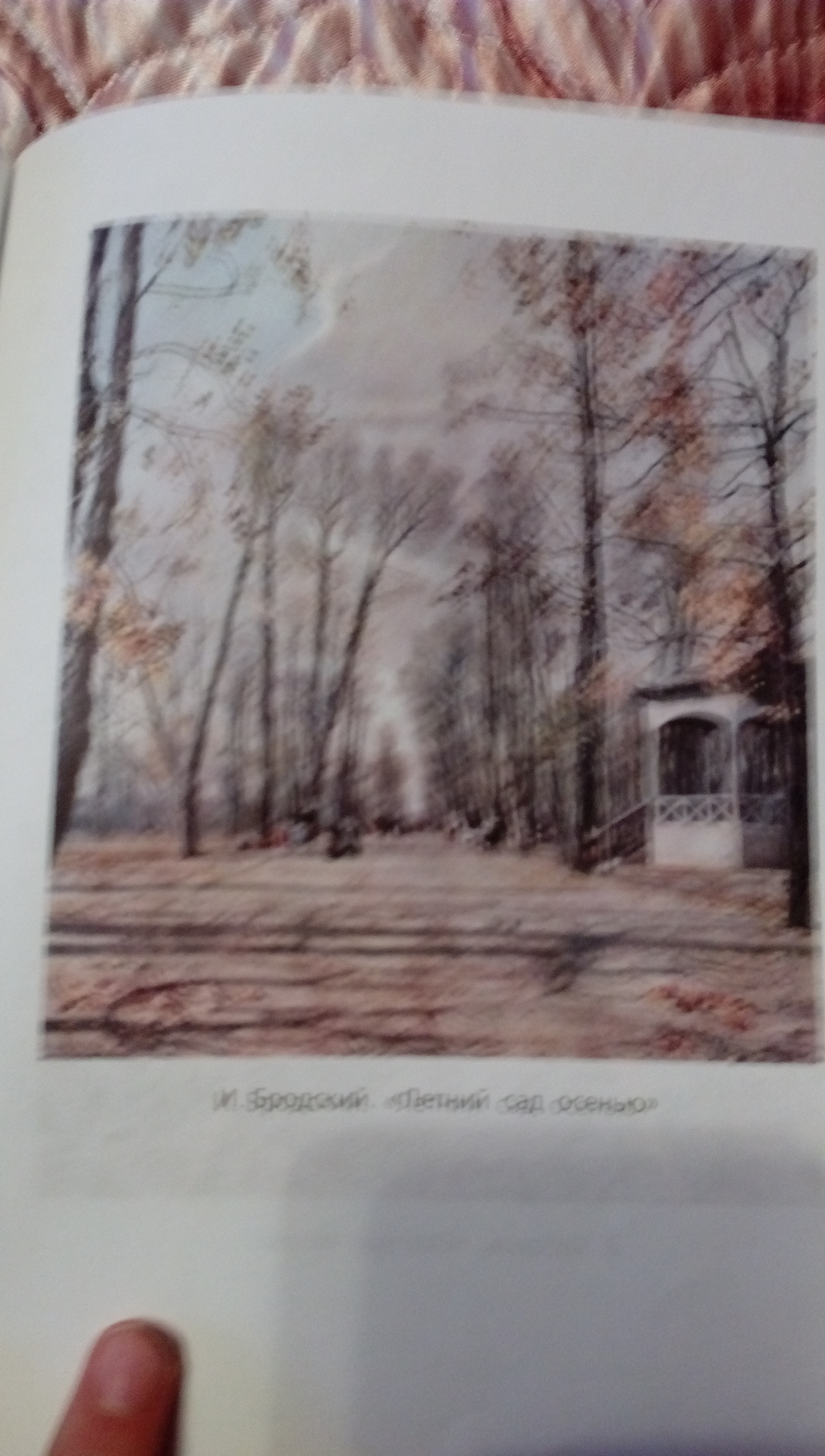 Перед нами картинами Бородского. На ней изображена осень. Деревья как буд то раскачиваются из за ветра. На переднем плане картины видно очень много людей и маленькая красивая, белая беседка с узорами. Весь тротуар засыпан листьями разных цветов. Небо пасмурное. Сверкает гроза. Солнца нет и облаков тоже.