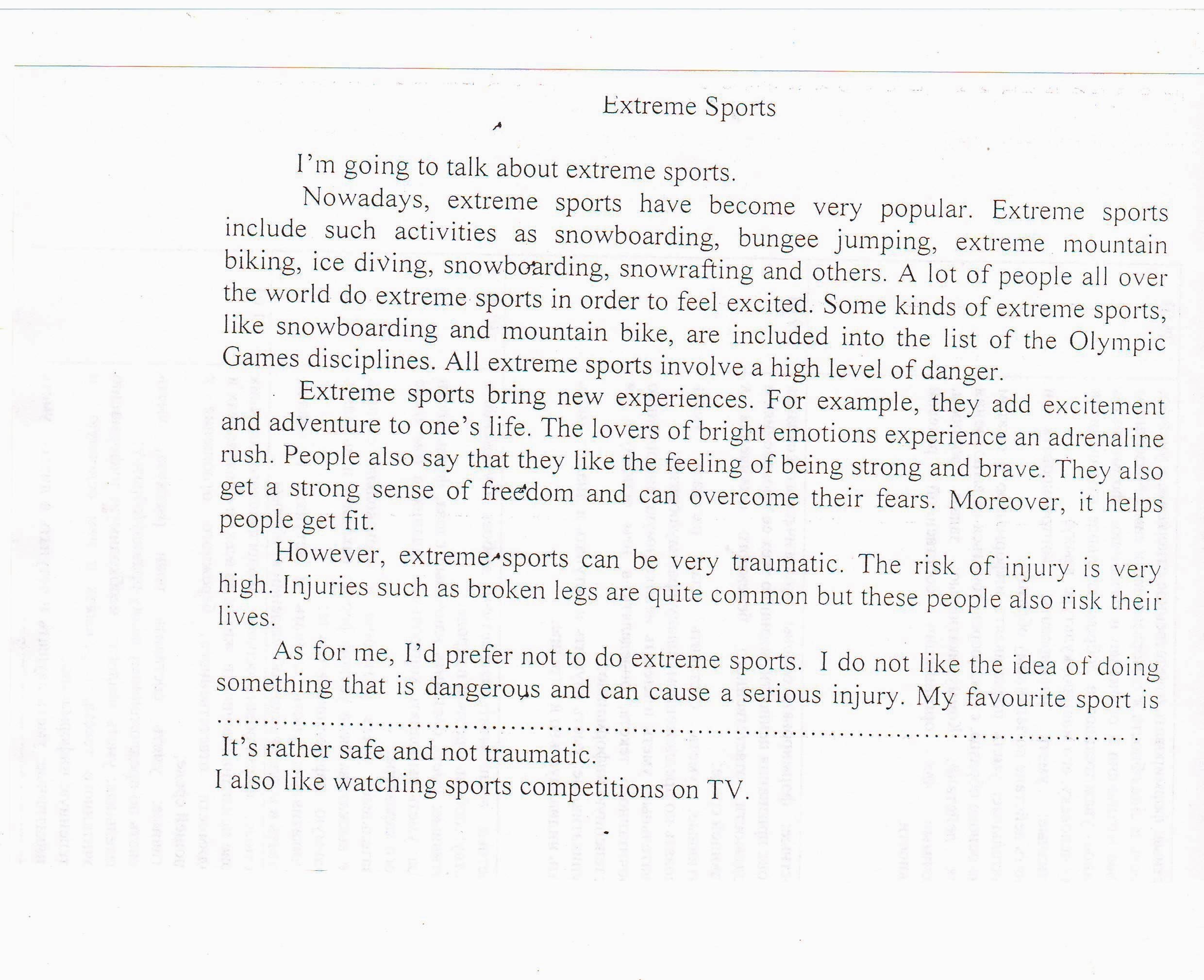 Как по мне, я предпочитаю не заниматься экстримальным спортом. Я не люблю делать то, что опасно и может принести серьезную травму. Мой любимый спорт это скорее безопасный, и не травматичный.