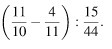 2)(11/10 - 4/11):15/44=81/110:15/44=81•44/110•15=3564/1650=54•66/25•66=54/25= 2 4/25