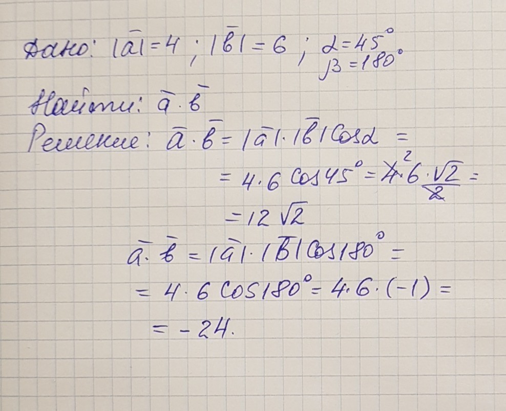 найдите скалярное произведение векторов a и b если |a|=4, |b|=6. Рассмотреть случаи когда угол между векторами a(альфа)=угол(вектор А, вектор Б) равен: