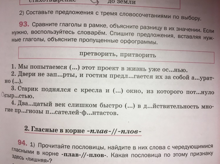 #93 Сравните глаголы в рамке,объясните разницу в их значении .Если нужно,воспользуйтесь словарём.Спишите предложения ,вставляя нужные глаголы,объясните пропущенные орфограммы