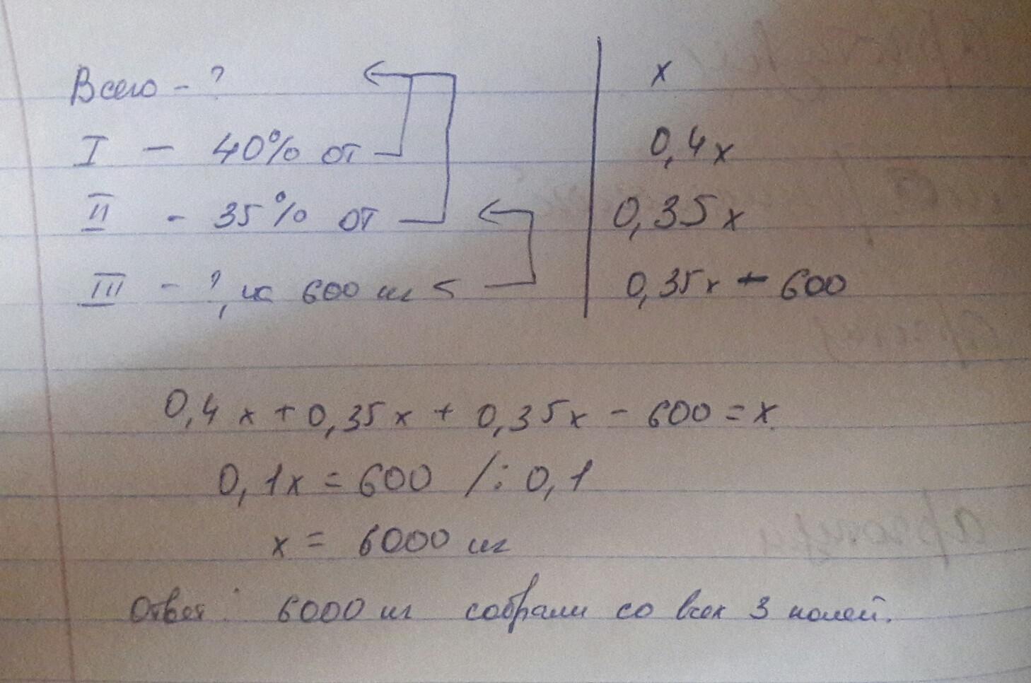 С трех лугов собрали сено. С первого луга - 40% всего сена, со второго - 35% всего сена. С третьего луга сена собрали на 600 кг меньше чем со второго. Сколько сена собрали со всех трех лугов вместе?