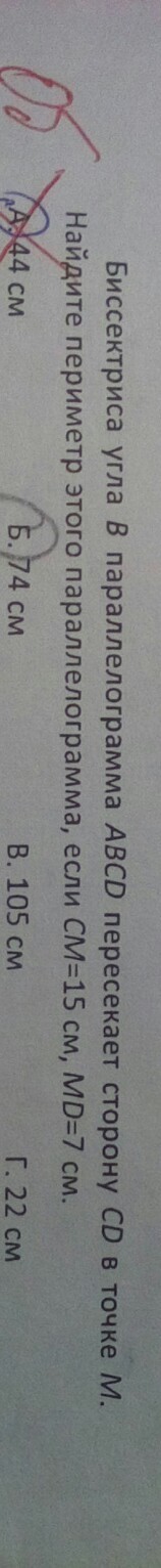 биссектриса угла B параллелограмма ABCD пересекает сторону CD в точке M Найдите периметр этого параллелограмма если CM 15 MD 7