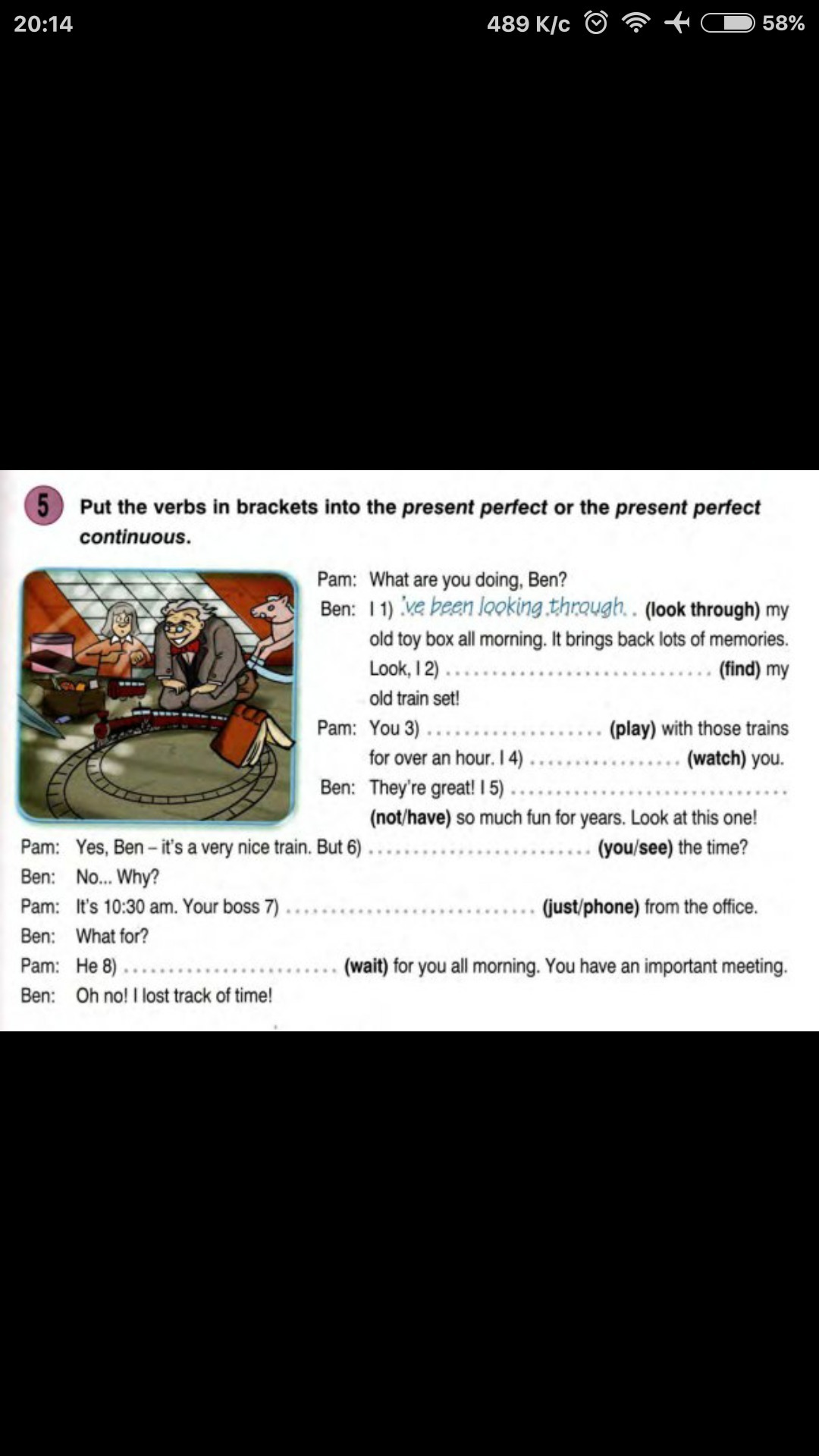 2) I have found 3) You have been playing 4) I have been watching you 5) I haven't had 6) have you seen 7) have just phoned 8) He has been waiting