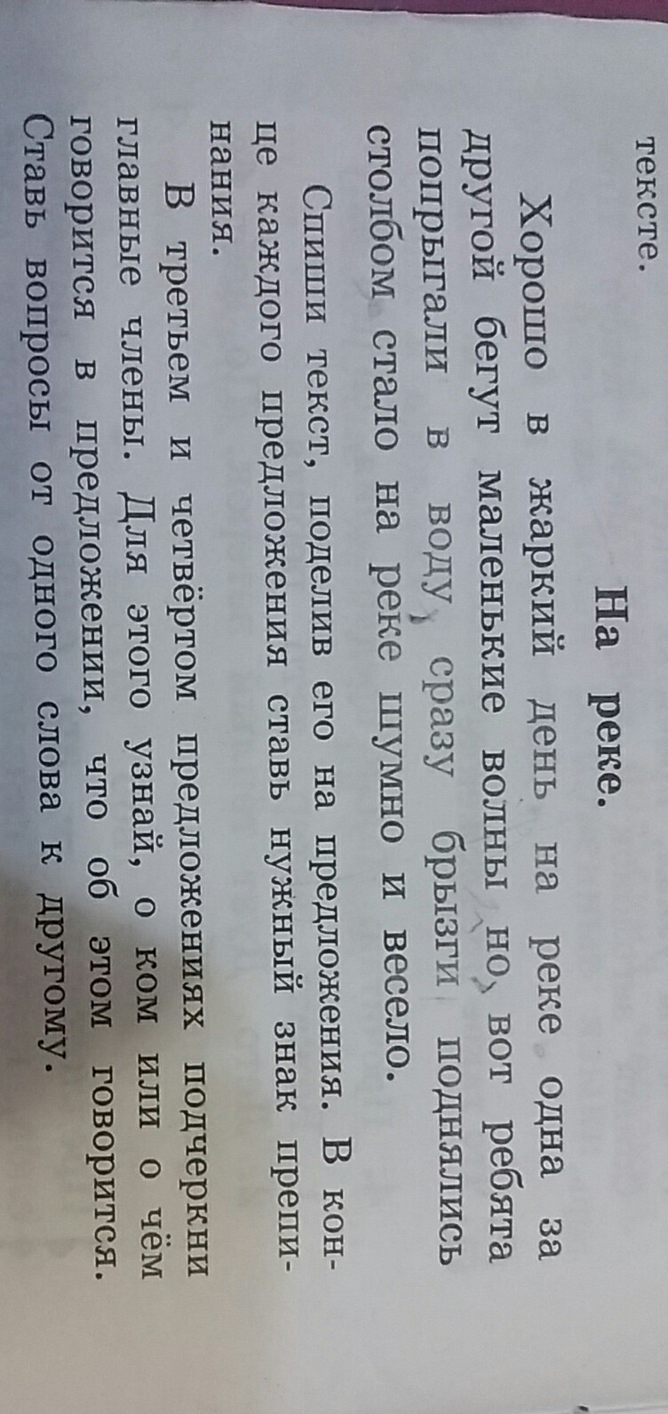 Хорошо в жаркий день на реке. Одна за другой бегут маленькие волны. Но вот ребята попрыгали в воду,сразу брызги поднялись столбом,стало на реке шумно и весело.