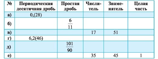 д) Периодическая дробь - 1,1(2); числитель - 11; знаменатель - 90; целая часть - 1