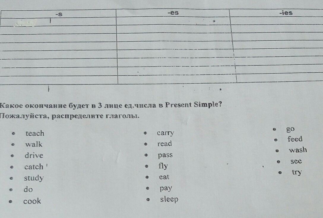 -s: walks drives cooks reads eats pays sees sleeps feeds