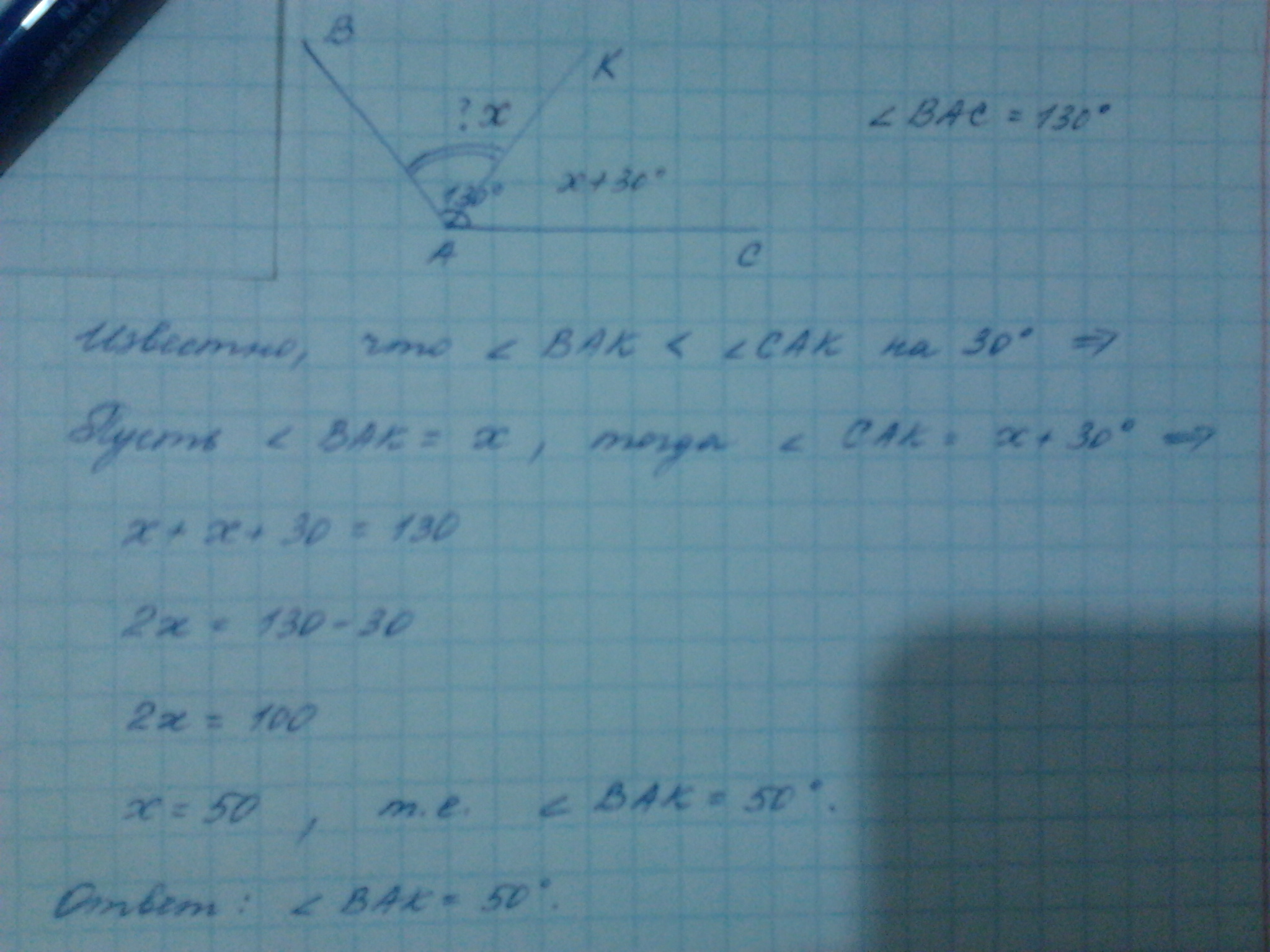 Угол BAC равен 130 градусам. Луч AK проходит внутри угла BAC, Так что угол BAK на 30 градусов меньше угла CAK. Найдите угол BAK