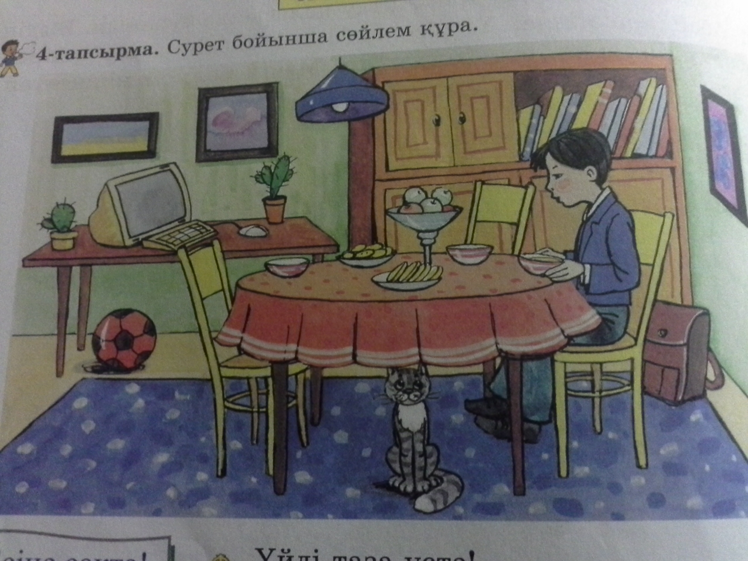 Бала жейді. Кафельдің артында оның портфелі. Кестеде алма бар. Үстелдің астындағы мысық отыр. Сол жақта компьютер, кактус. Бұл үстелдің астында доп.
