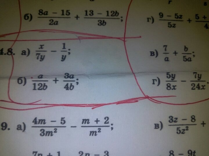 а). x/7y-1/y=(x-7)/7y; б). a/12b+3a/4b=(a+9a)/12b=10a/12b=5a/6b; в). 7/a+b/5a=(35+b)/5a; г). 5y/8x-7y/24x=(15y-7y)/24x=8y/24x=y/3x.