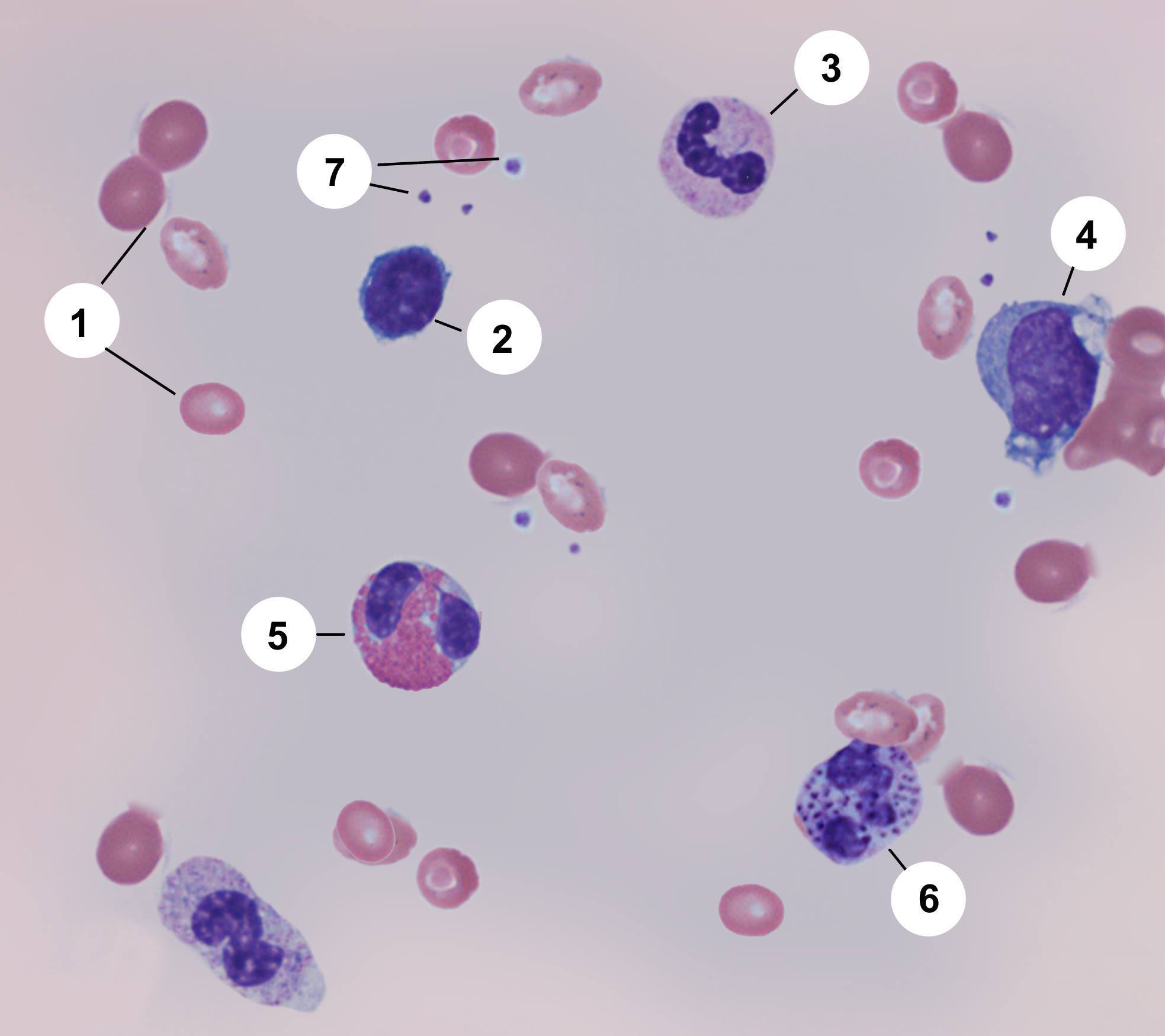 Вы получили мазок крови и рассматриваете его под микроскопом. Укажите функции клеток, отмеченных цифрами. а) свёртывание крови б) противовирусный и противораковый иммунитет в) защита от паразитов г) высвобождение гистамина в аллергической реакции д) транспорт кислорода е) антибактериальный иммунитет, выделение активных форм кислорода ж) могут превращаться в макрофаги