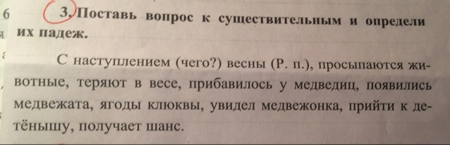 Просыпаются (кто?) животные (и.п.), теряют (в чём?) в весе (п.п.), прибавилось (у кого?) у медведиц (р.п), появились (кто?) медвежата (и.п), ягоды (чего?) клюквы (р.п), увидел (кого?) медвежонка (р.п), прийти (к чему?) к детёнышу (д.п), получает (что?) шанс (в.п).