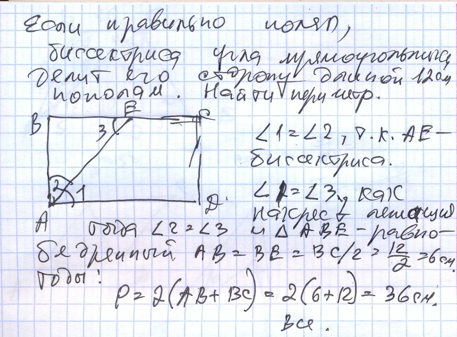 Биссектриса угла прямоугольника делит ее сторону равную 12 см пополам. Найти периметр.