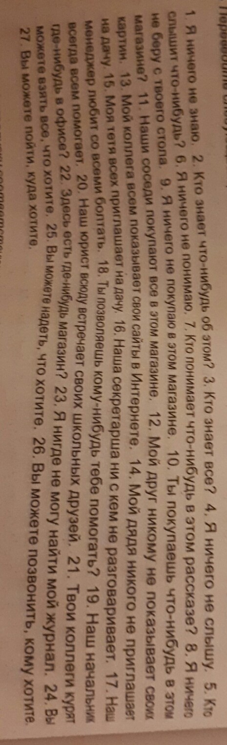 1.I do not know anything. 2.Who knows anything about this? 3. Wo knows all? 4. I can't hear anything. 5. Who hears anything? Вот тебе 5 предложений с русского на английский.