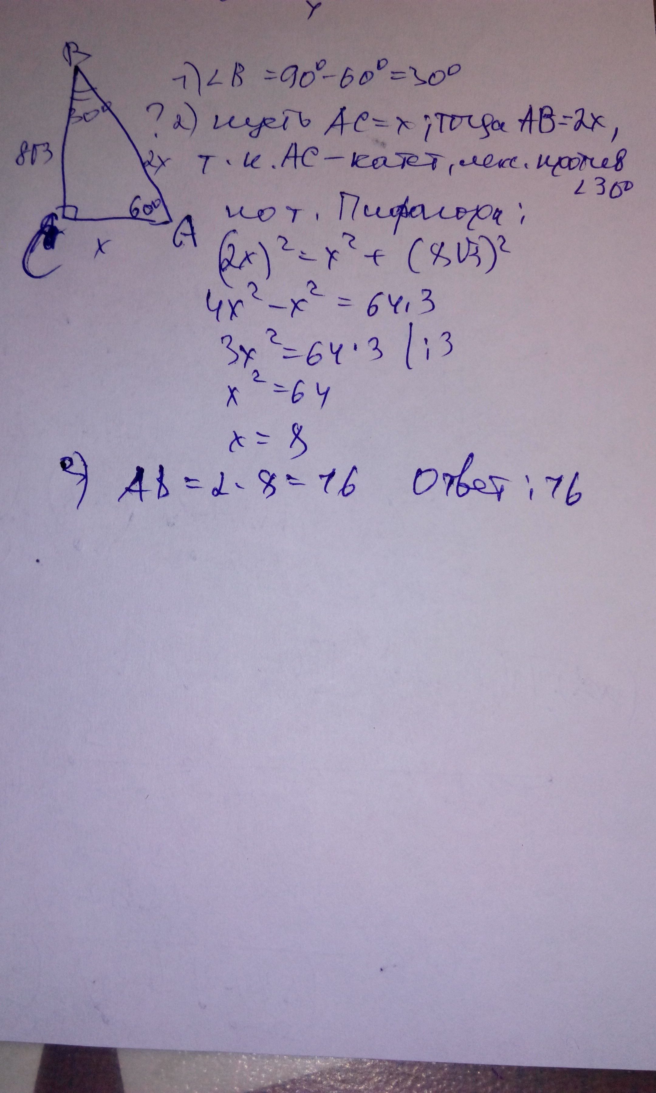 В △ABC угол C = 90°, угол A равен = 60°, ВС = 8√3. Найдите AB.