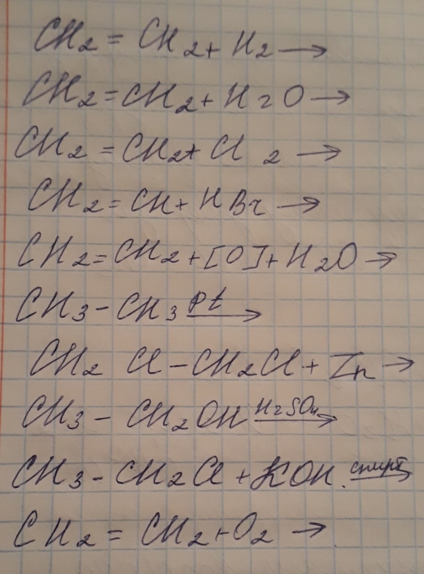 9)CH3-CH2Cl+KOH(спирт)—>CH2=CH2+KCl+H2O