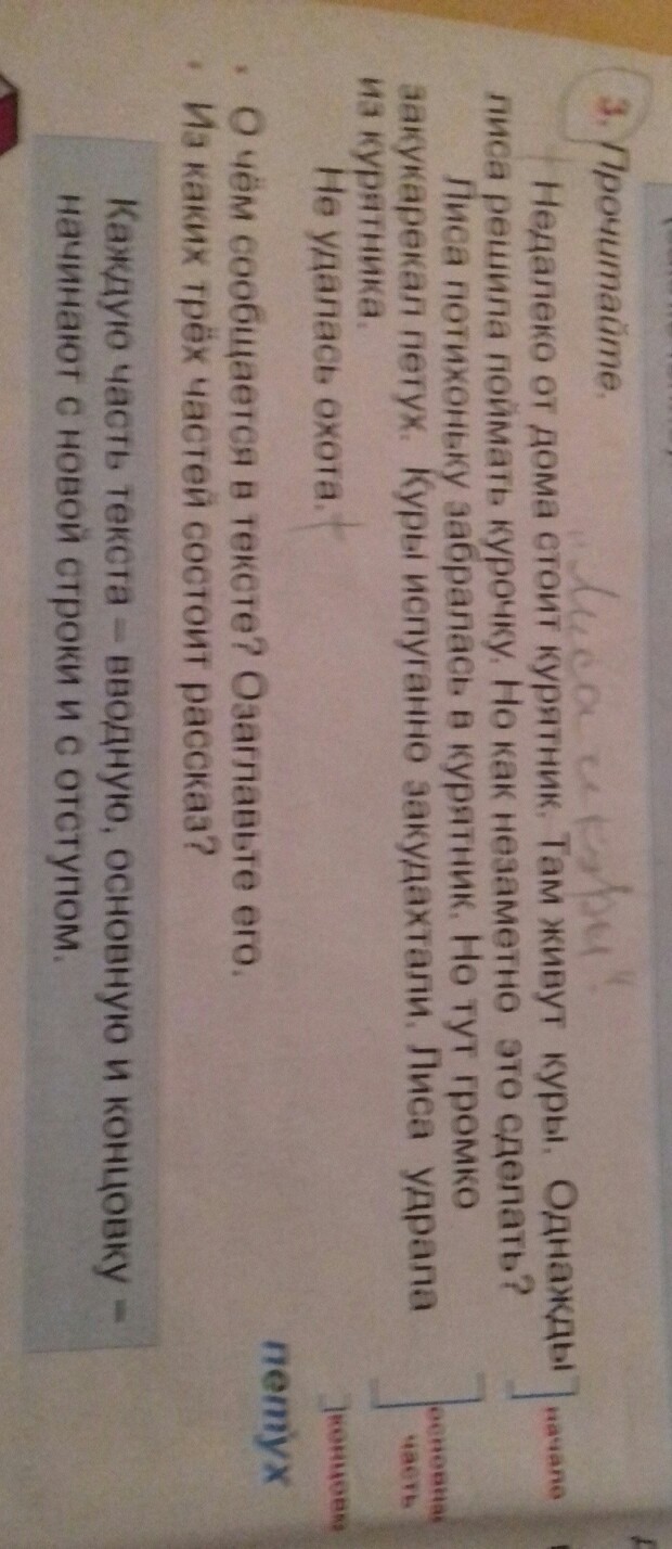В тексте сообщается о лисе,которая забралась в курятник.Но из-за переполоха кур не могла поймать курицу и убежала ни с чем.