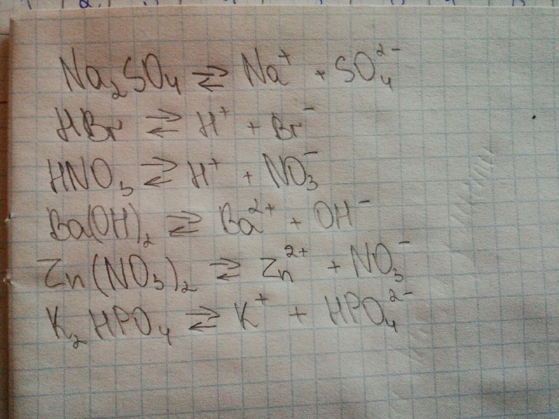 Напишите цравнение диссоциации в растворе следующих соединений:а )сульфат натрия; б)бромоводородная кислота; в)азотная кислота; г)гидроксид бария д.нитрат цинка; е)гидрофосфат калия.Прочитайте уравнения.