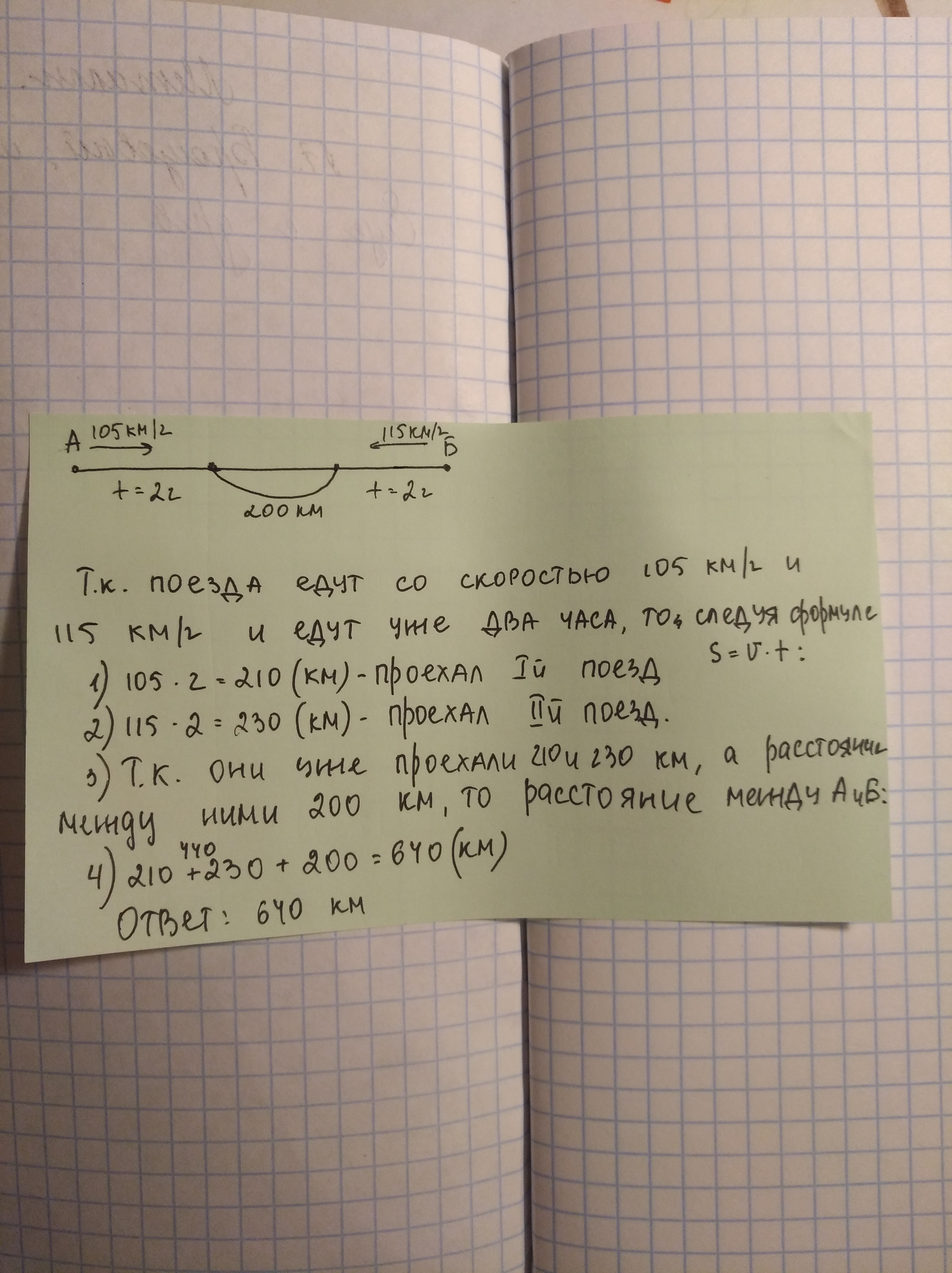 Из двух городов одновременно выехали на встречу друг другу два поезда со скоростями 105 км/ч и 115 км/ч. Через 2 часа движения, расстояние между ними составило 200 км. Чему равно расстояние между городами?