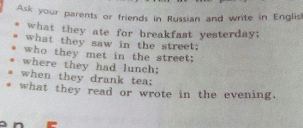 Yesterday my parents ate for breakfast some eggs, some sandwiches and drank two cups of coffee. They saw a very big rat in the street. They met my teacher. They had lunch at home. At 5 o'clock they drank tea. They read newspapers in the evening.