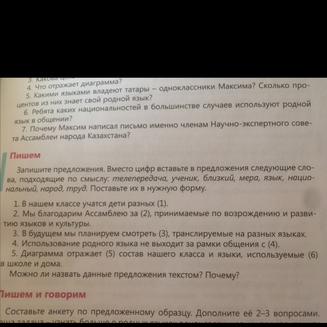 Запишите предложение . Вместо цифр вставьте в предложение следующие слова, подходящие по смыслу: телепередача , ученик , близкий , мера , язык , национальный, народ , труд. Поставьте их в нужную форму .