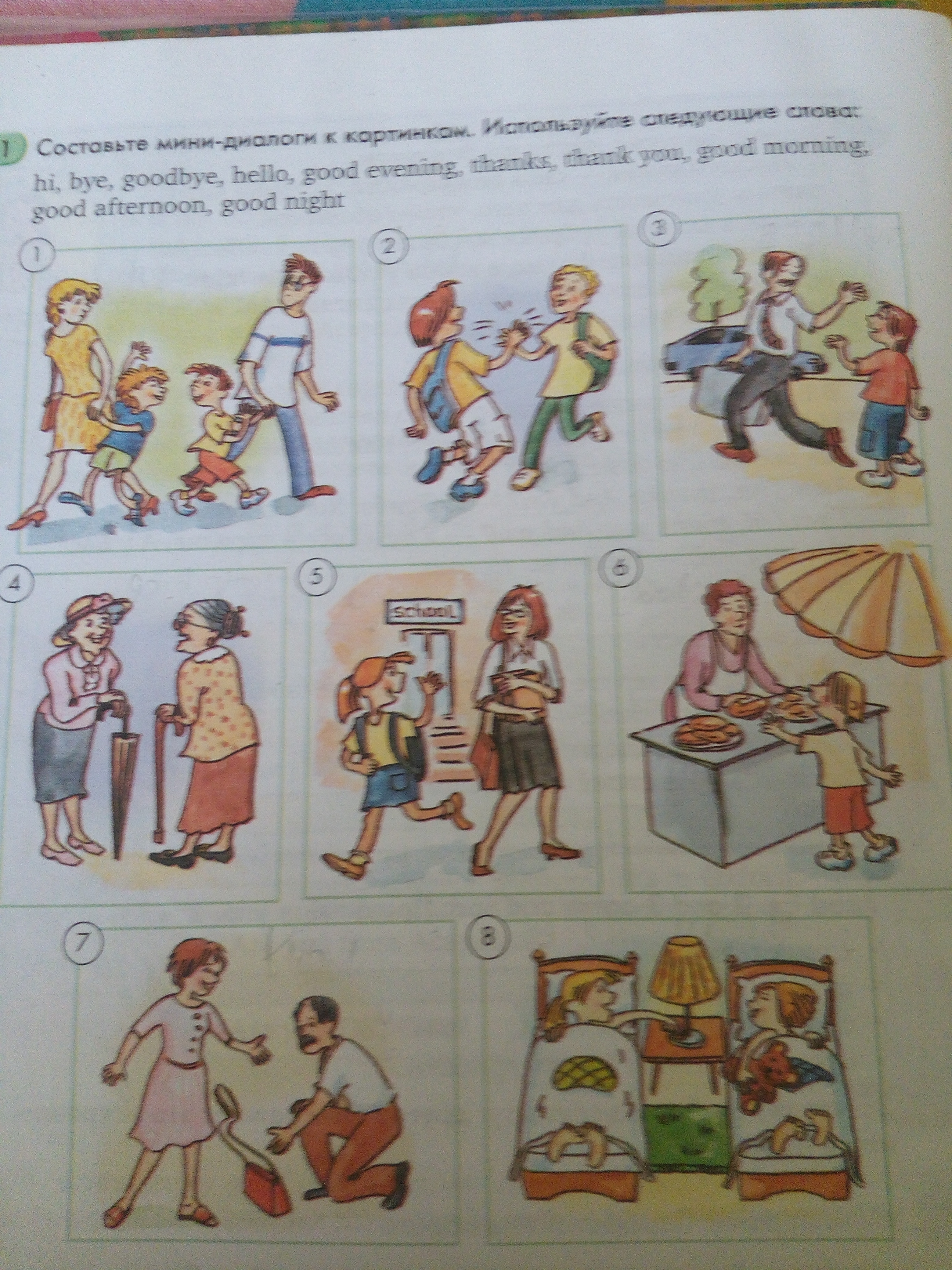 1. goodbay 2. Hi 3. good morning 4. Hello 5. good eving 6. bye 7. Thank you 8. good night