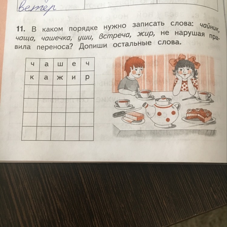 В каком порядке нужно записать слова: чайник,чаща, чашечка, уши, встреча , жир, не нарушая правила переноса ?