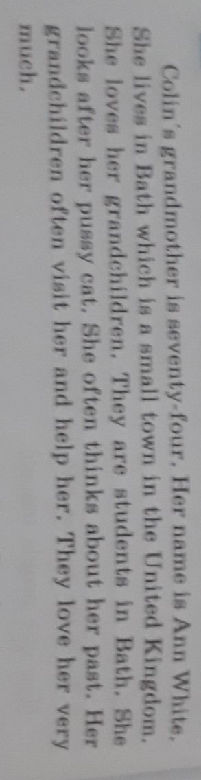Colin's grandmother was seventy- four. Her name was Ann White. She lived in Bath which was a small town in the United Kingdom. She loved her grandchildren. They were students in Bath. She looked after her pussy cat.She often thought about her past. Her grandchildren often visited her and helped her. They loved her very much.