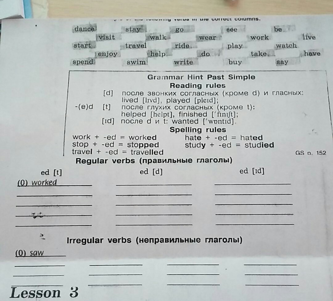 Irregular went(go),wore(wear),was (be),took(take),rode(ride),did(do),had(have),spent(spend),swam (swim),wrote(write),bought( buy),said (say).