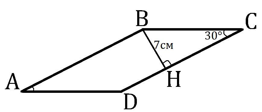 В параллелограмме ABCD угол С=30° а перпендикуляр к прямой СD равен 7см,Р=60см,найти углы и стороны параллелограмма, пожалуйста помогите
