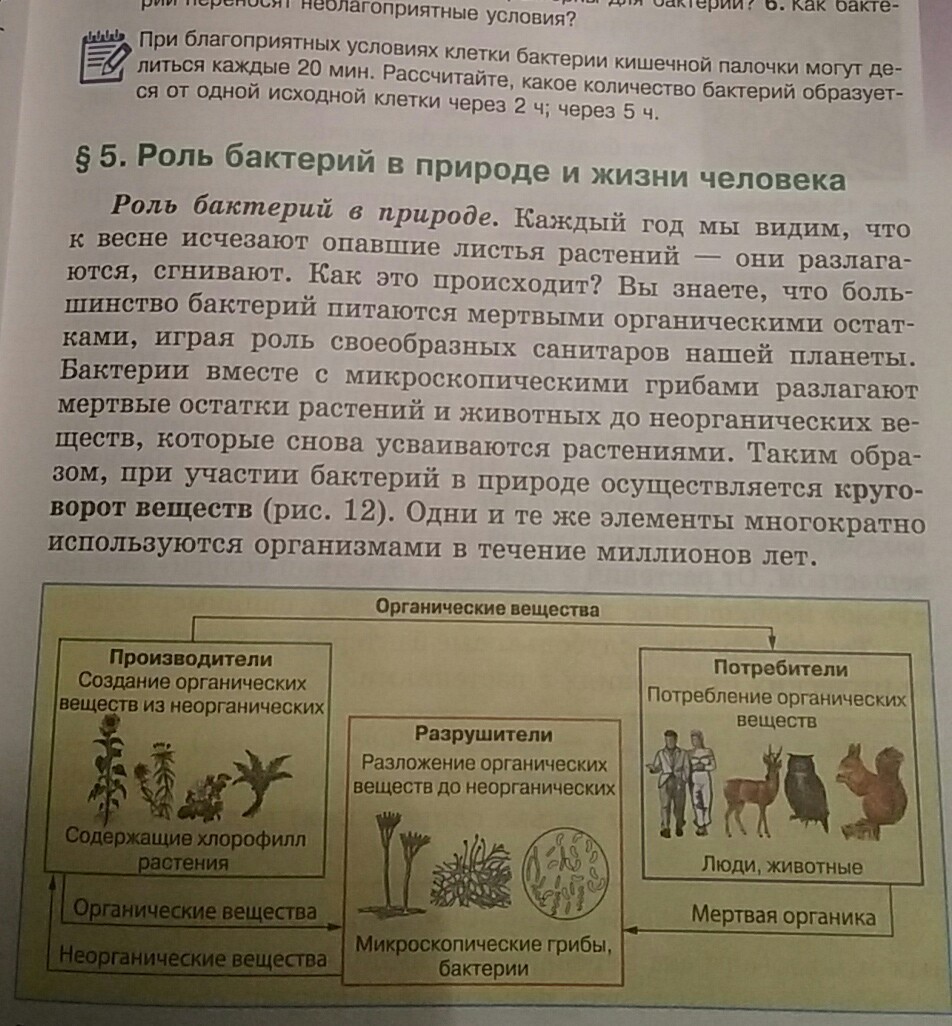 каждый год мы видим, что к весне исчезают опавшие листьяразтений- они разлагаются и сгнивают. Как это происходит? ты уже наверно знаешь что большинство бактерий питаются мертвыми органическими очтатками, играя роль своеобразных санитаров нашей планеты. Бактерии вместе с микроскопическими грибами разлагают мертвые остатки растений и животных до неорганических веществ, которые снова усваиваются растениями. Таким образом, при участии бактерий в природе осуществляется круговорот веществ.