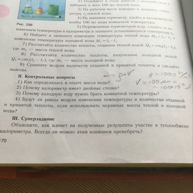 Таким образом, как это ни кажется странным, проверяемое положение о равенстве отданного и принятого количества теплоты выполнения работы будет подтверждено точнее, если в калориметр наливать сначала холодную воду, а затем доливать горячую (как и указано в работе).