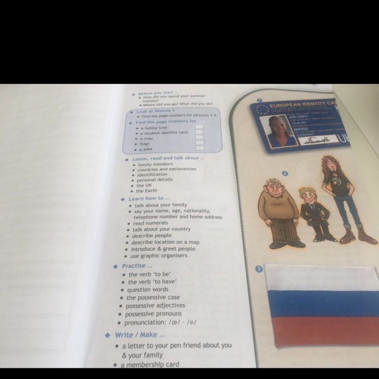 Здесь ничего не нужно делать,здесь описывается то ,что ты будешь проходить в данном модуле.А сверху в синем окошке найти страницы учебника на которых есть картинки,которые изображены справа.А во втором задании найти страницы,где упоминается о семейном дереве,студенческой карте,карте и т.д.