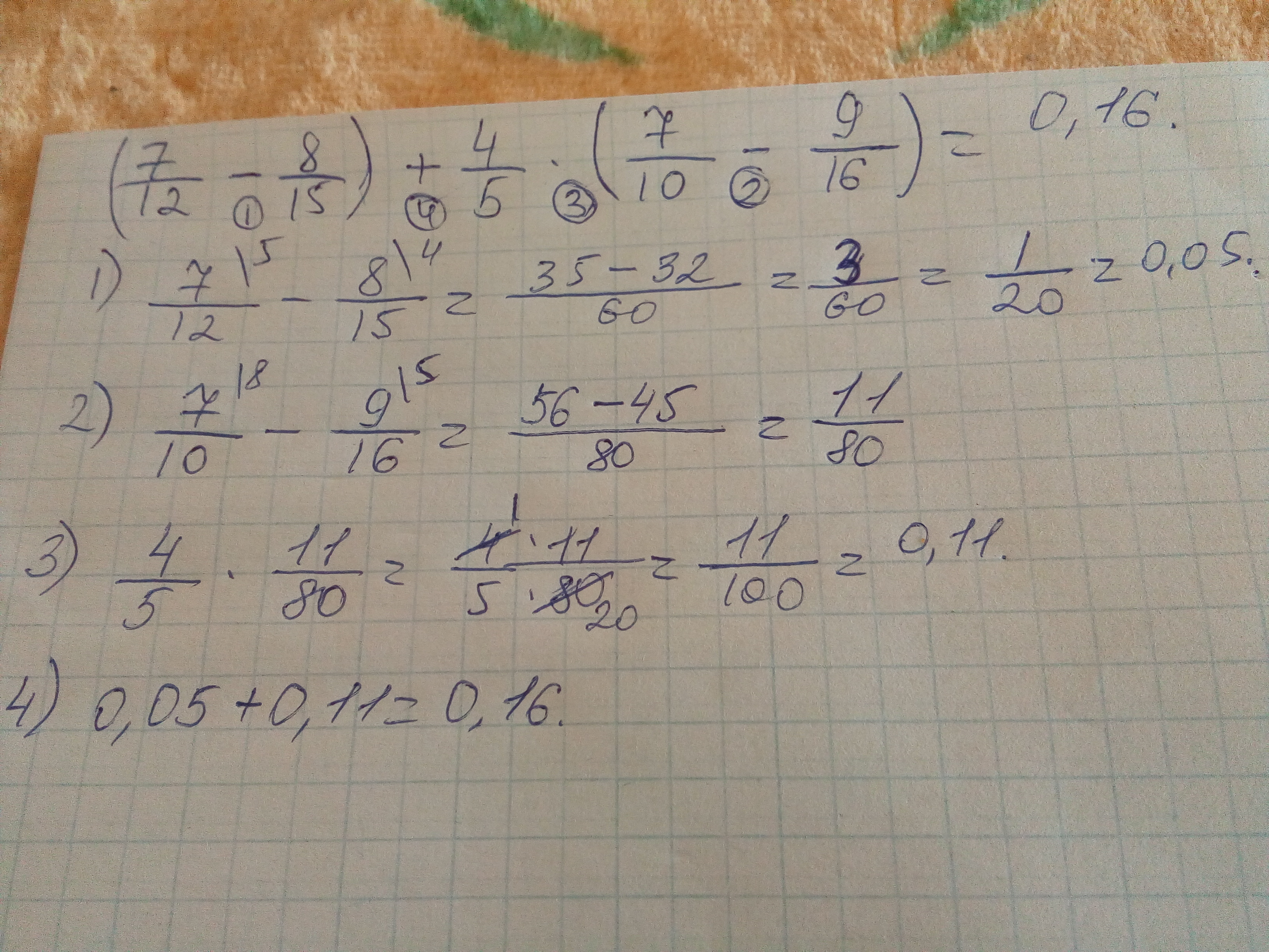 В этом выражение 4 действия. У меня ответ получился 0,16