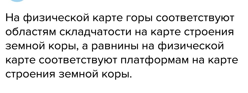 Общий вывод: сравнивая 2 карты, можно увидеть соответствие внутреннего строения и форм рельефа. Платформам и плитам соответствуют низменности и равнины, Складчатым областям соответствуют горы, причем области молодой складчатости - молодые, высокие горы. Области старой скдчатости - старые, низкие горы.