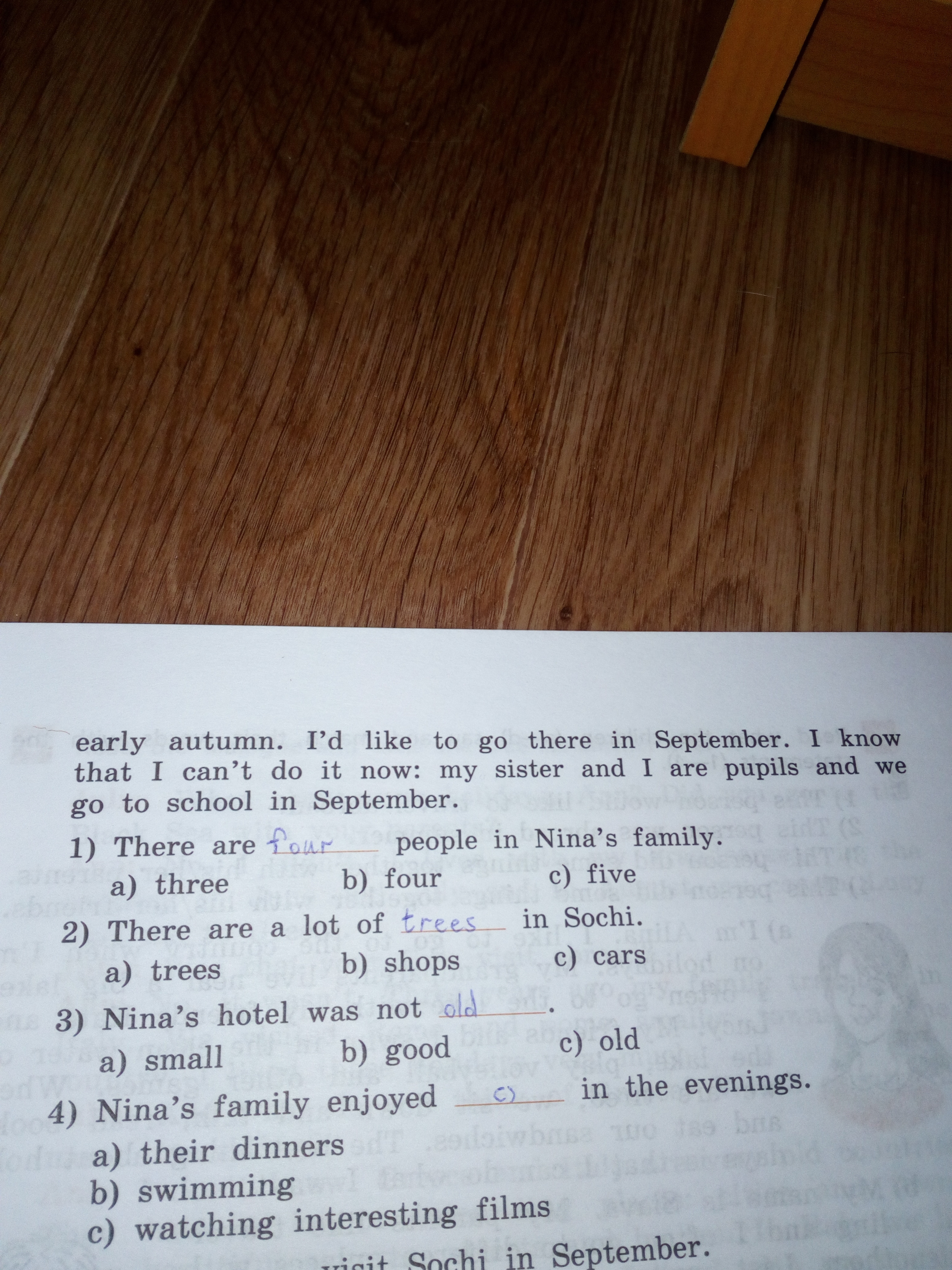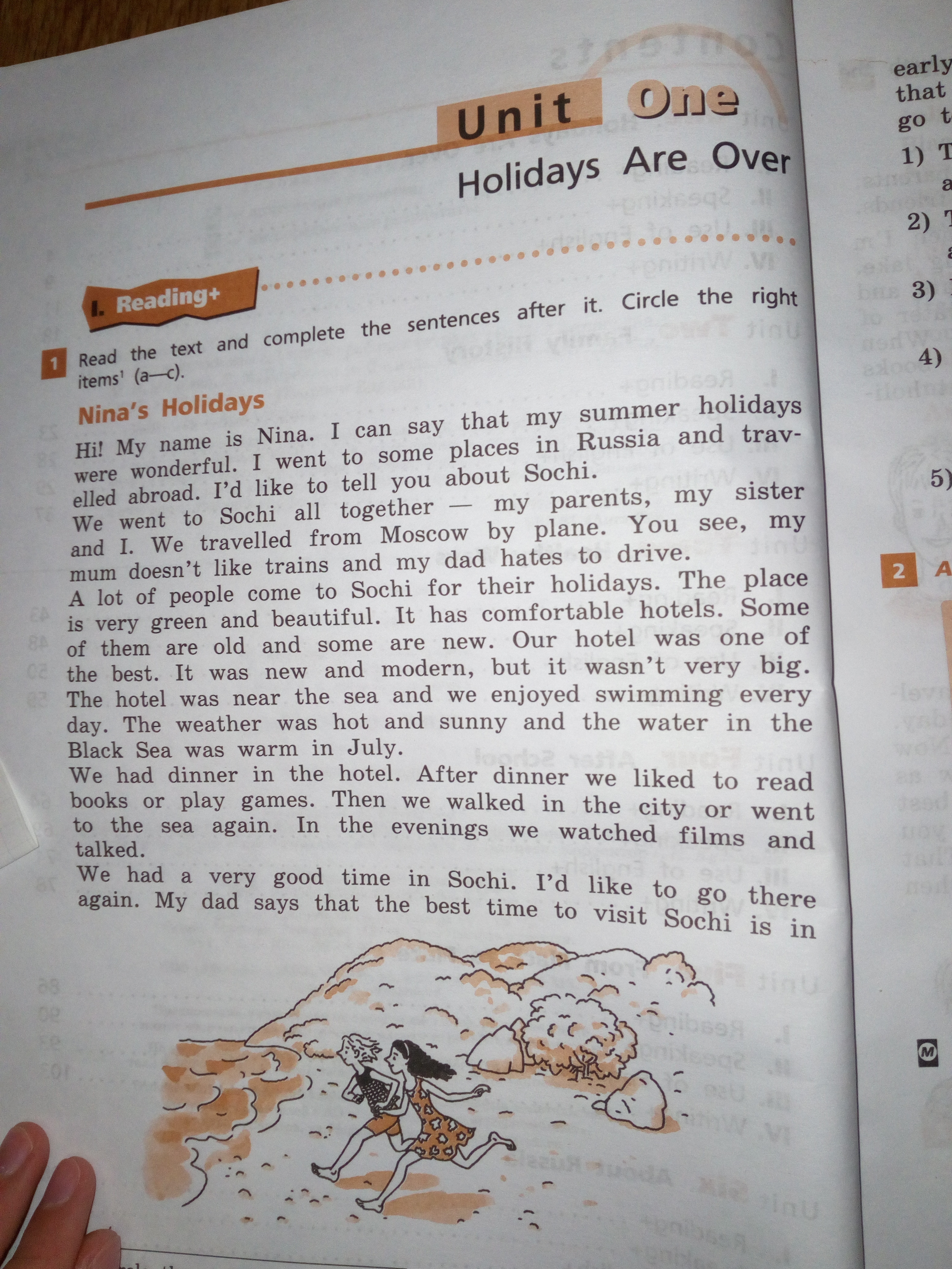 что мои летние каникулы Хит Меня зовут Нина. Я могу сказать, что Россия и прекрасна. Я побывал в некоторых местах за границей. Я хотел бы рассказать вам о Сочи. Мы все вместе ходили в Сочи, мои родители, сестра и я. Мы выехали из Москвы на самолете. Видишь ли, моя мама не любит поезда, и мой отец ненавидит ехать. Многие люди приезжают на отдых. Здесь очень зеленые и отели Сочи. Некоторые красивые. У него удобные из них старые, а некоторые новые. Наш отель был одним из лучших. Это было новое и современное, но оно было не очень большим. Отель был недалеко от моря, и мы наслаждались плаванием каждый день. Погода была жаркая и солнечная, а вода в Черном море была теплой в июле. Мы обедали в отеле. После обеда нам нравилось читать книги или играть в игры. Затем мы пошли в город или снова отправились в море. По вечерам мы смотрели фильмы и говорили, что у нас было очень хорошее время в Сочи. Я хотел бы снова поехать туда. Мой папа говорит, что лучшее время для посещения Сочи вранняя осень. Я бы хотел поехать туда в сентябре. Я знаю, что я не могу сделать это, теперь моя сестра и я ученики, и мы ходим в школу в сентябре.