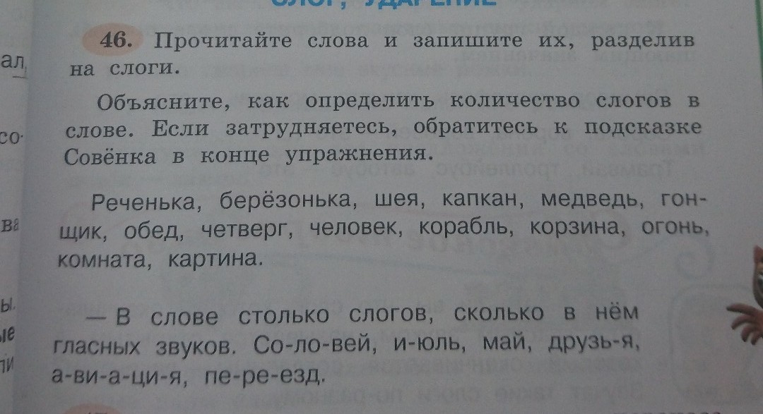 Если ты затрудняешься определить сколько в слове слогов, просто посчитай сколько в них гласных. Например:кошечка 3 гласных значит 3 слога.Проверка: ко-шеч-ка.