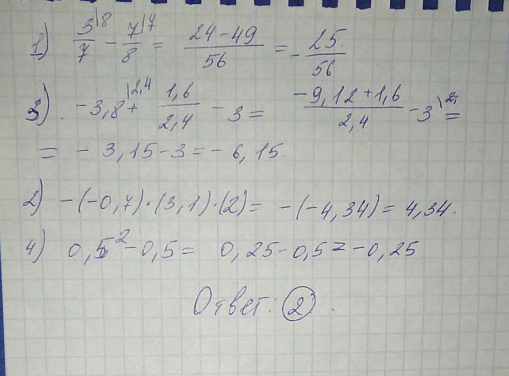 Запишите в ответе номера выражений, значения которых положительны1) 3/7-7/8 3)-3,8+1,6/2,4-32)-(-0,7)*(3,1)*(2) 4)0.5^2-0,5