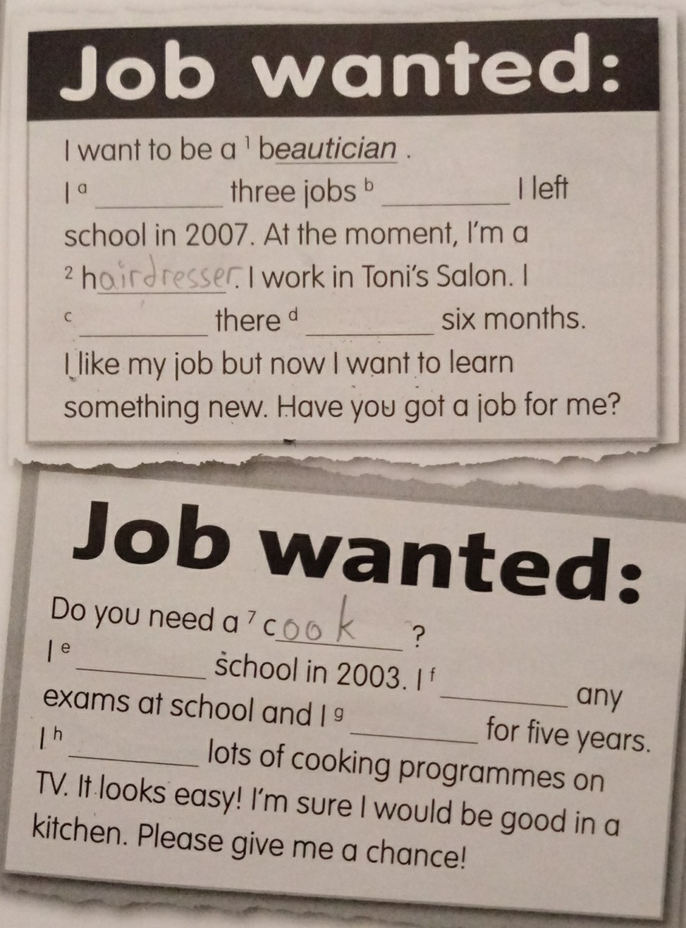 I have three jobs since I left school in 2007. At the moment,I'm a hairdresser. I work in Tony's salon.I work there for six months.I like my job but now I want to learn something new Have you got a job for me?