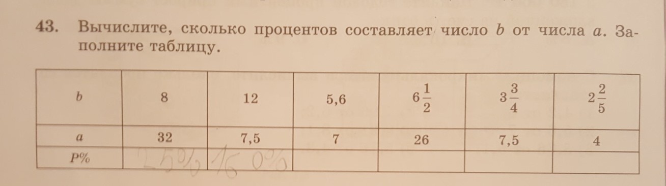 Вычислите, Сколько процентов составляет число b от числа a. Заполните таблицу.