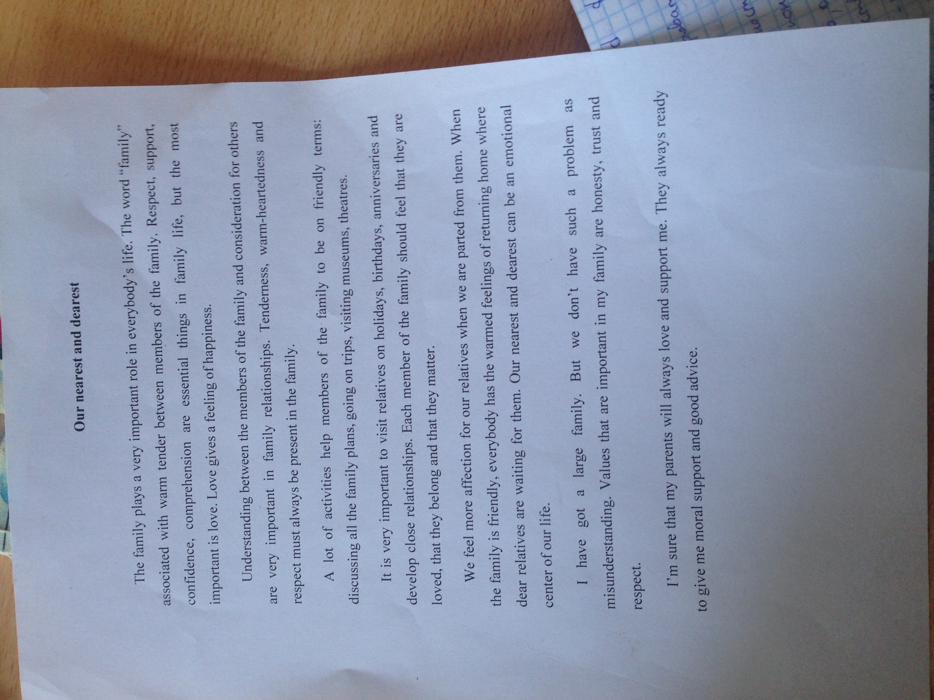 The family plays a very important role in everybody's life. Respect, support and understanding between family members are very important. A lot of activities help members to get on well. For example, discussing all the family plans, going on trips, visiting museums and theaters. It's also very important to visit your relatives on different holidays and other events. It helps to develop close relations. We feel more affection for our relatives when we are parted from them. When the family is friendly, everybody fells happiness. Our nearest and dearest can be an emotional center of our life. I have a large family and we never have misunderstandings. Honesty, trust and respect are important in our family. My parents always help me with advice