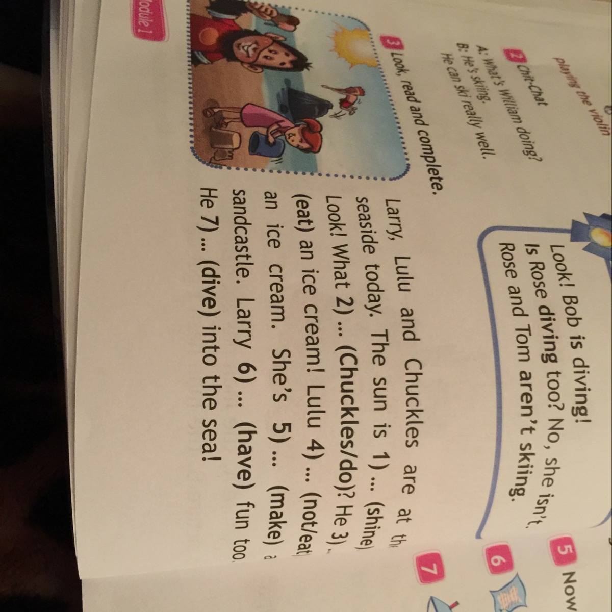 Larry, Lulu and Chuckles are at the seaside today. The sun is shining. Look! What Chuckles doing? He eating an ice cream! Lulu don't eating an ice cream. She's making а sandcastle. Larry having fun too. He diving into the sea!