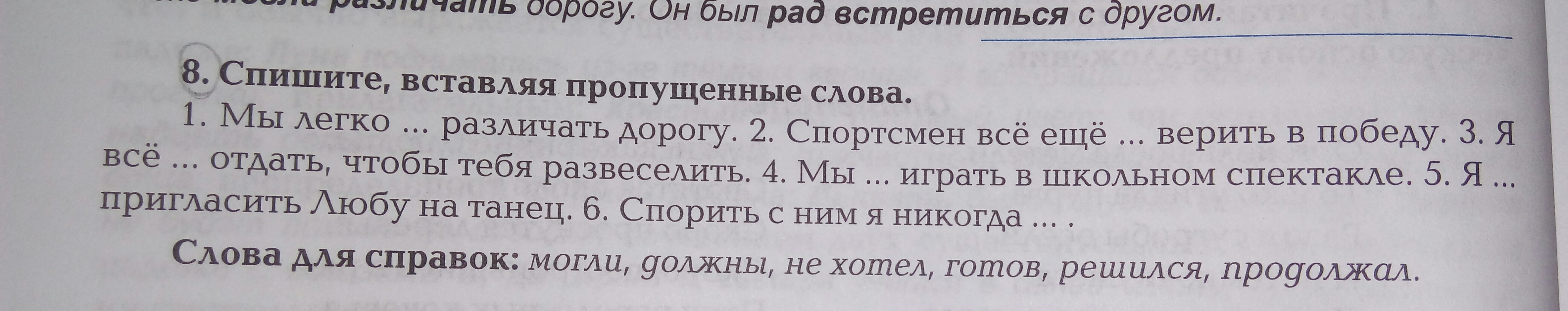 Мы легко могли различать дорогу. Спортсмен все еще продолжал верить в победу. Я все готов отдать, чтобы тебя развеселить. Мы должны играть в школьном спектакле. Я решился пригласить Любу на танец. Спорить с ним я никогда не хотел.