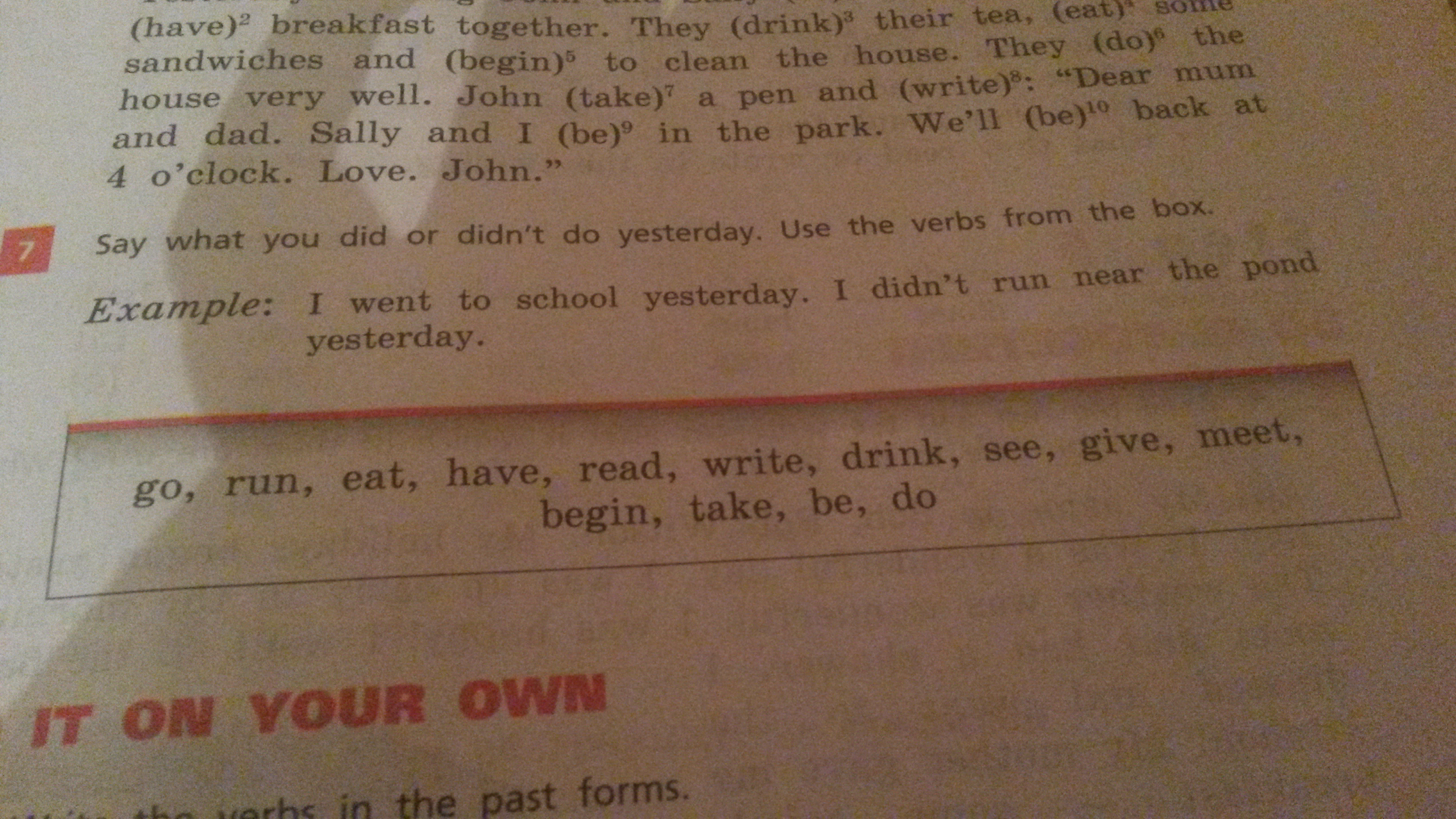 I ate pizza yesterday, i didn't have breakfast yesterday.2)I wrote letter yesterday, I didn't drink coffee yesterday3)I saw a full moon yesterday, I didn't give pen to my friendd,4) I began learn English yesterday ,I didn't take money yesterday 5)I was at home yesterday, I didn't do homework yesterday