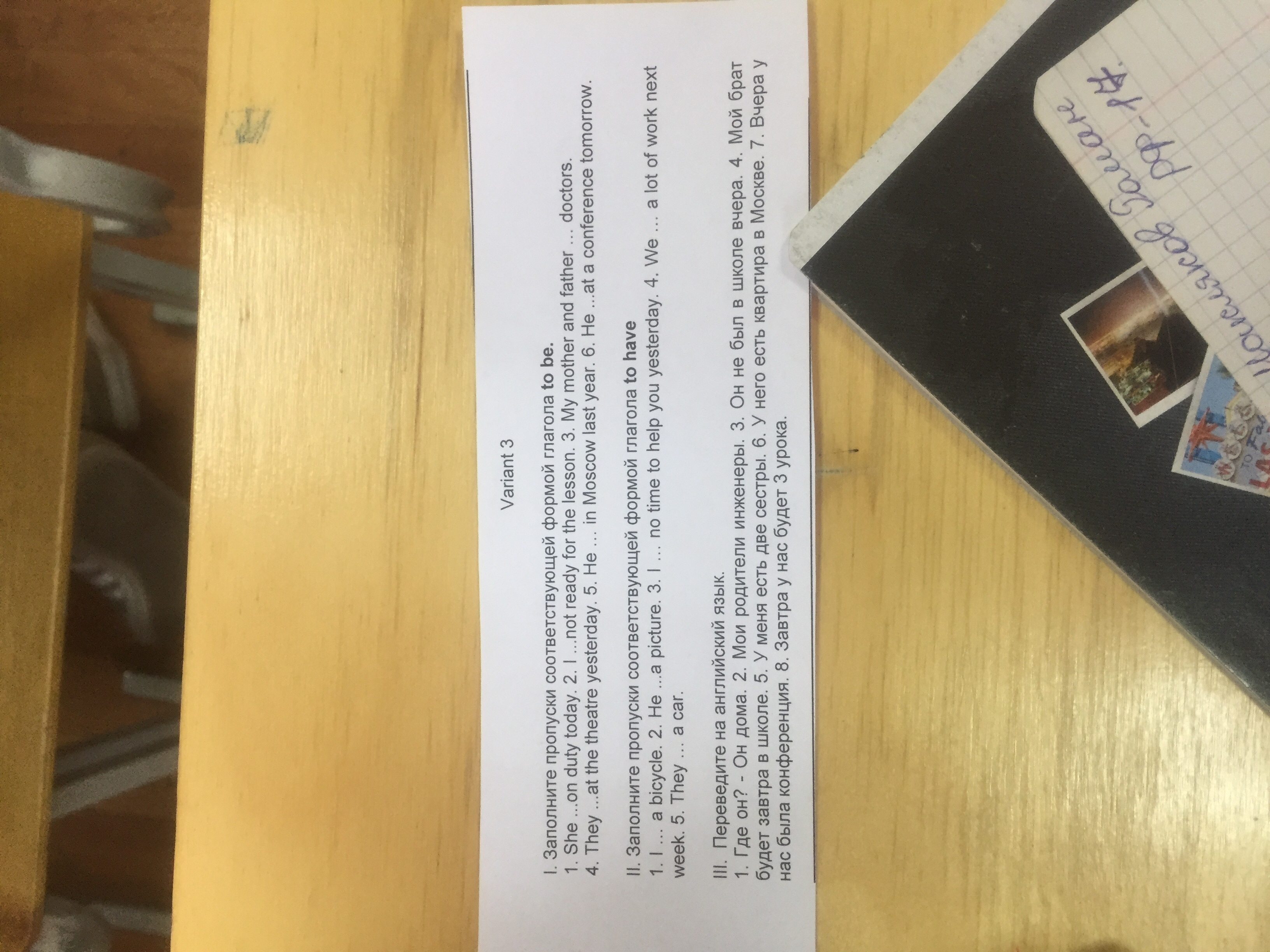 1. Where is he? - He is at home. 2. My parents are engineers. 3. He was not at school yesterday. 4. My brother will be at school tomorrow. 5. I have two sisters. 6. He has a flat in Moscow. 7. We had a conference yesterday. 8. We will have three lessons tomorrow.