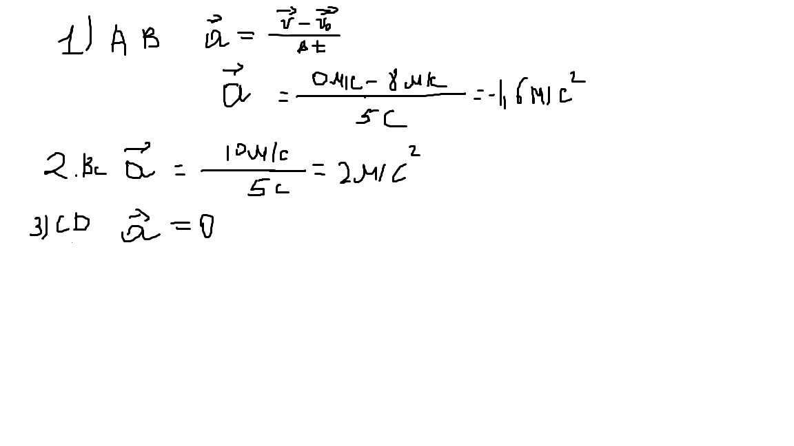 Для расчета воспользуемся формулой для нахождения ускорения. На отрезке АВ движение равнозамедленное поэтому и ускорение отрицательно. Участок CD равномерное движение так скорость не меняется с течением времени