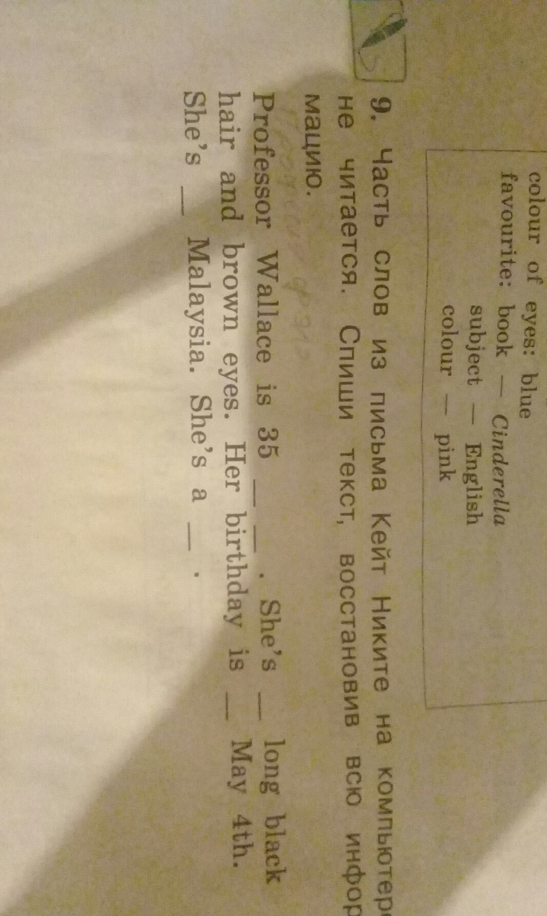 professor wallace is 35 years old. She's has long black hair and brown eyes. Her birthday is on May 4th. She's from Malaysia. She's a .(профессия, она есть в учебнике вроде)